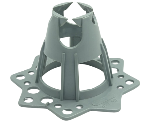 Distantier individual de plastic este produs prin procedeul de extrudare la cald din plastic reciclat. Decupajele se realizeaza prin stantare. Instalare rapida. Confera stabilitate in timpul confectionarii armaturii. Distantier pentru placa cu suport moale, acoperire beton 40/50 in functie de cum se pozitioneaza.